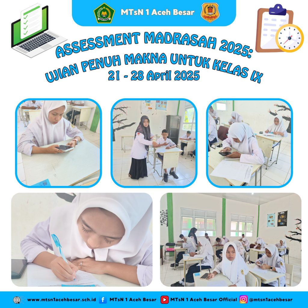 Indrapuri, 21 April 2025 – MTsN 1 Aceh Besar sedang melaksanakan Assessment Madrasah (AM) tahun 2025 untuk seluruh siswa kelas IX. Ujian yang berlangsung mulai 21 hingga 28 April ini menjadi evaluasi akhir yang penting bagi para siswa sebelum melanjutkan perjalanan pendidikan mereka ke jenjang yang lebih tinggi.