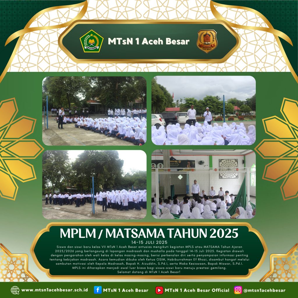 Madrasah Tsanawiyah Negeri (MTsN) 1 Aceh Besar mengadakan kegiatan Masa Pengenalan Lingkungan Madrasah (MPLS) atau lebih dikenal dengan MATSAMA, khusus bagi siswa-siswi baru kelas VII Tahun Ajaran 2025/2026. Kegiatan yang berlangsung pada tanggal 14–15 Juli 2025 ini sukses dilaksanakan dengan penuh semangat, kegembiraan, dan keakraban di lapangan madrasah dan mushalla MTsN 1 Aceh Besar.