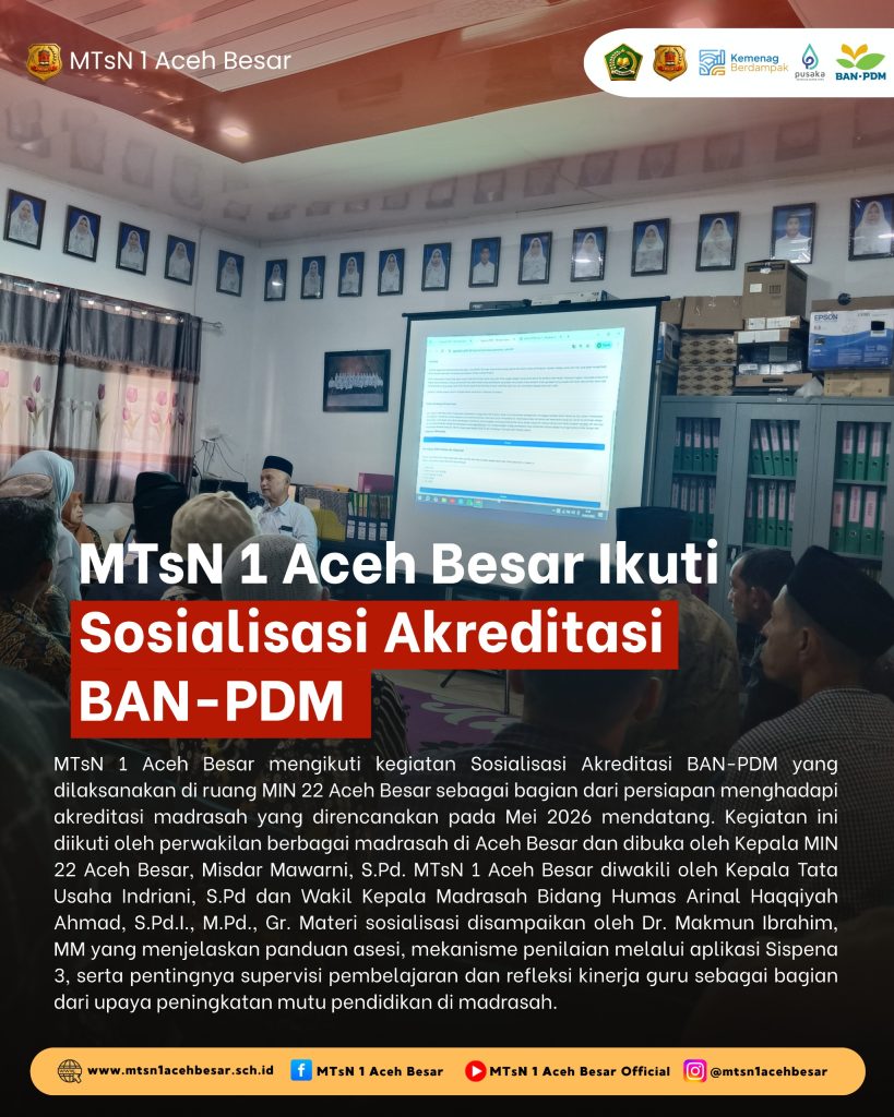 MTsN 1 Aceh Besar mengikuti kegiatan Sosialisasi Akreditasi BAN-PDM yang dilaksanakan di ruang pertemuan MIN 22 Aceh Besar. Kegiatan ini diikuti oleh perwakilan berbagai madrasah di Kabupaten Aceh Besar sebagai bagian dari persiapan menghadapi proses akreditasi satuan pendidikan.