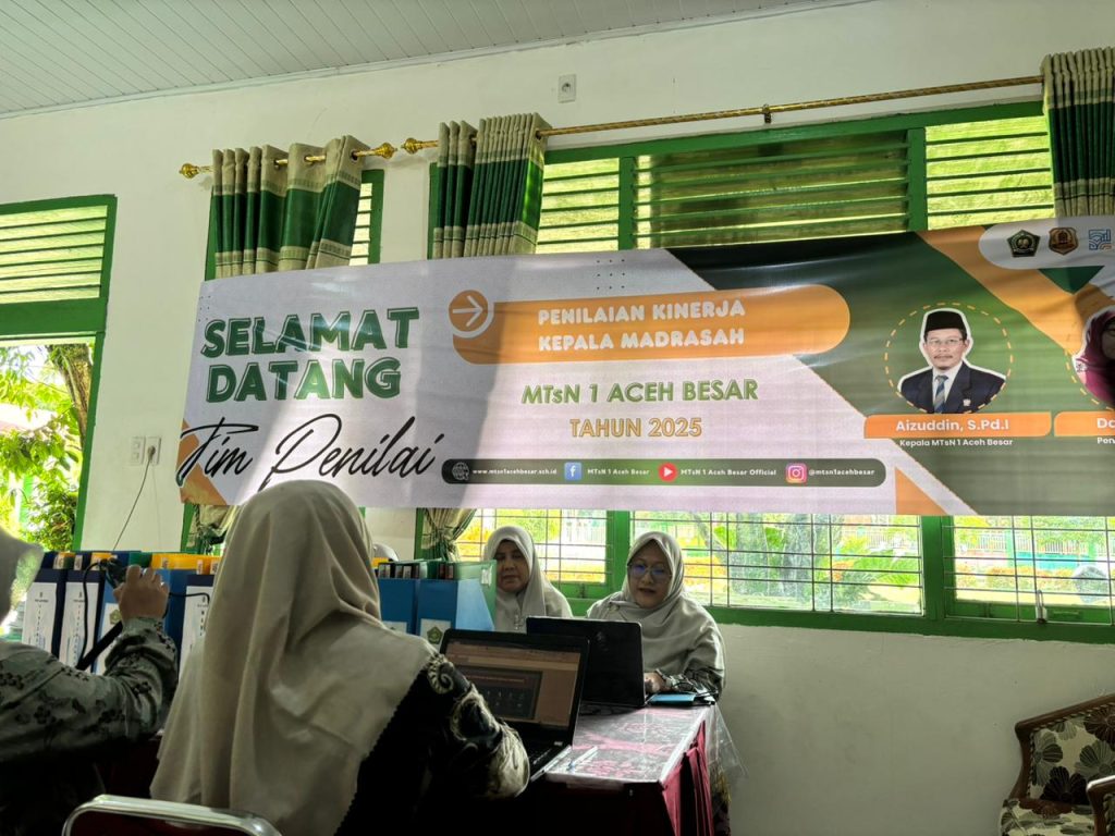 MTsN 1 Aceh Besar melaksanakan Penilaian Kinerja Kepala Madrasah (PKKM) Tahun 2025 pada Rabu, 1 April 2026, bertempat di lingkungan madrasah. Kegiatan ini menghadirkan Pengawas Pembina sekaligus penilai, Darwati, S.Ag, serta diikuti oleh Kepala Madrasah Aizuddin, S.Pd.I, Kepala Tata Usaha Indriani, S.Pd.I, para wakil kepala madrasah, dan tenaga kependidikan.